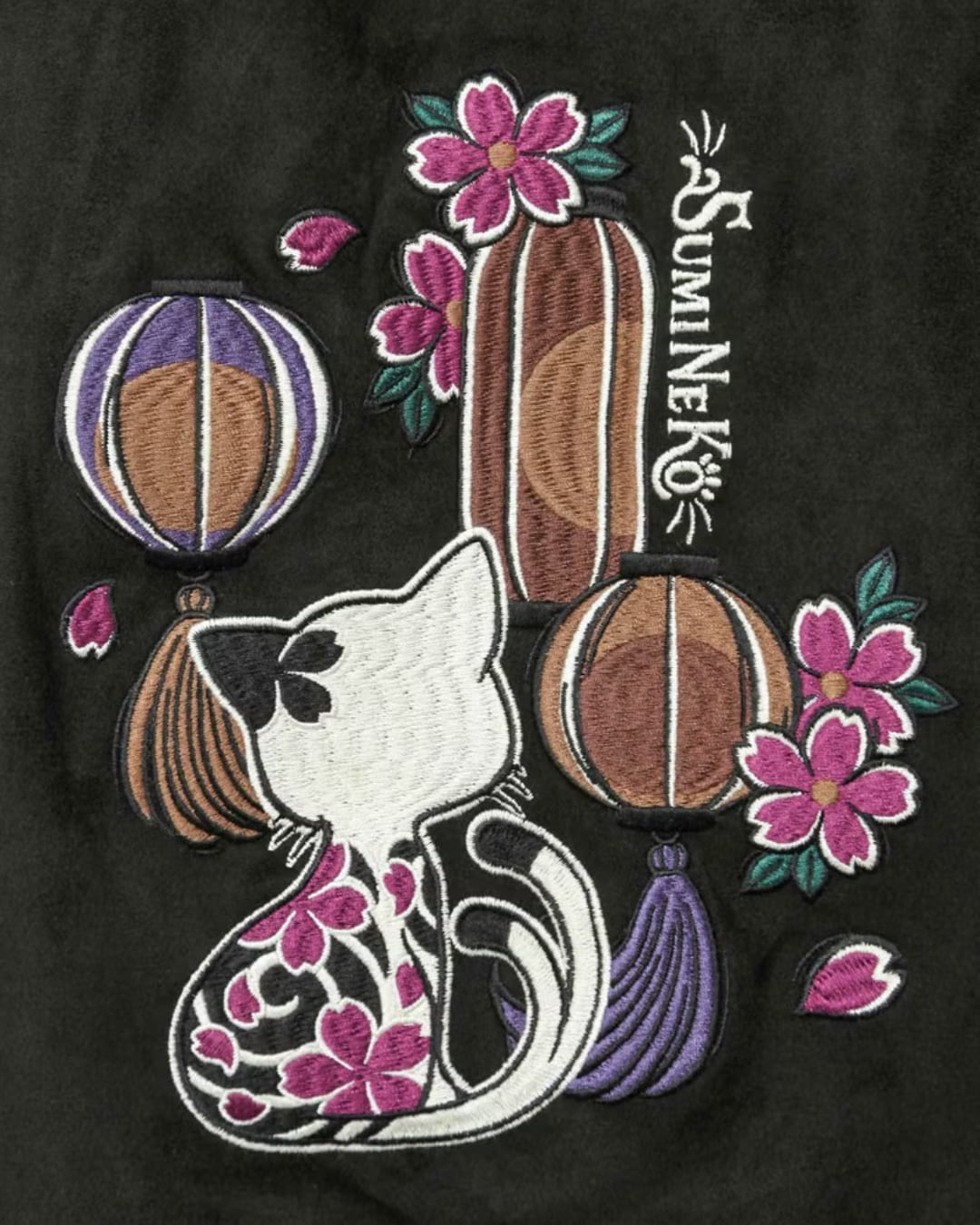 提灯の下に佇むスミネコを総刺繍で表現し、