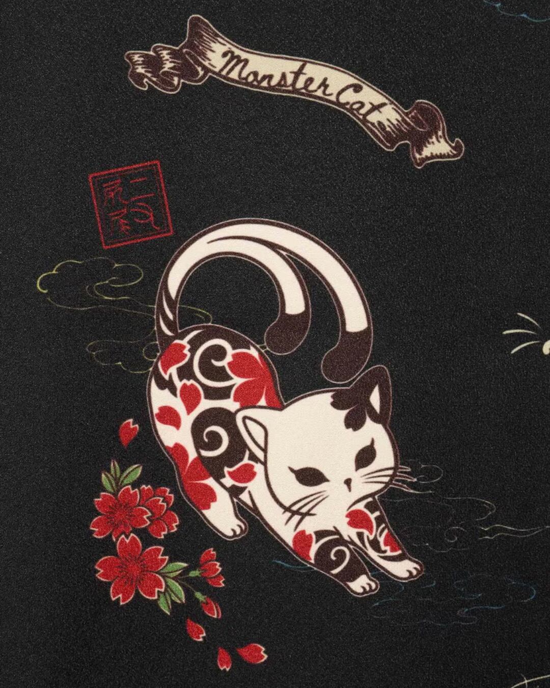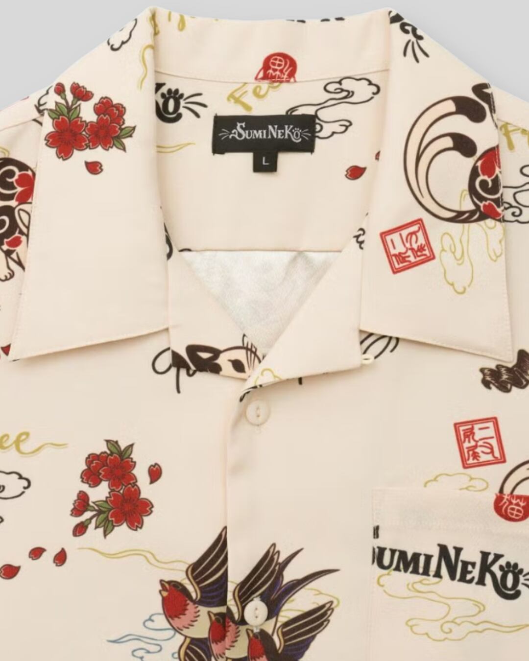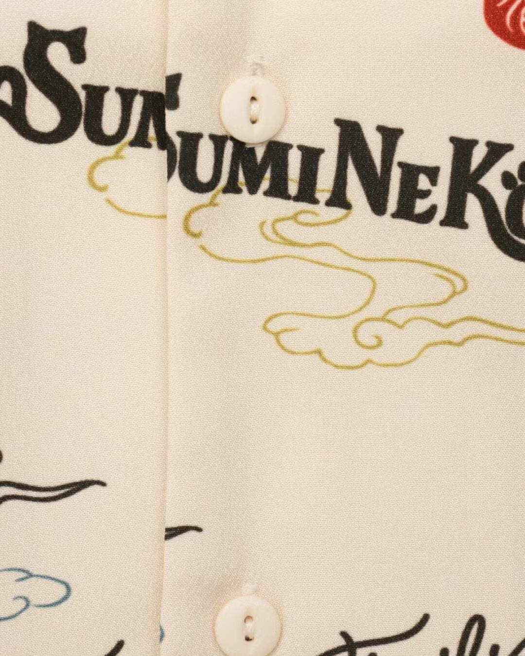 猫らしく伸びをしているブランドのイメージキャラである猫又の「スミネコ」とツバメをメインに、桜の花やロゴデザインを総柄であしらった一着。